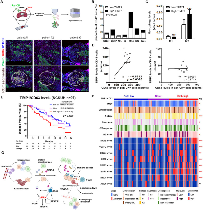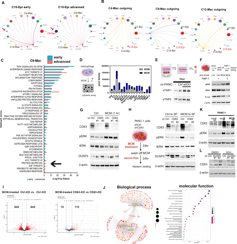 Results: Kras mutation induces the formation of pancreatic intraepithelial neoplasia (PanIN), these lesions also exhibit significant apoptotic signals. Single-cell RNA sequencing identified a subset of ERKactiveDUSP2low cells continuing to expand from early to advanced stage PDAC. In vitro and in vivo studies reveal that early infiltrating macrophage-derived tissue inhibitor of metallopeptidase 1 (TIMP-1) is the key factor in maintaining the ERKactiveDUSP2low cell population in a CD63-dependent manner. The ERKactiveDUSP2low cancer cells further exacerbate macrophage-mediated cancer malignancy, including loss of epithelial trait, increased lymphangiogenesis, and immune escape. Digital spatial profiling analysis of PDAC samples demonstrates the colocalization of TIMP-1high macrophages and CD63high cancer cells. The presence of TIMP-1high macrophages and CD63high epithelial cells correlates with poor prognosis in PDAC.
