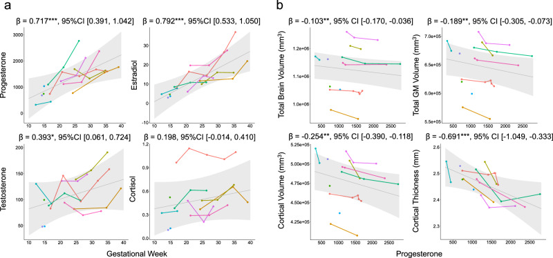 Pregnancy is a period of profound biological transformation. However, we know remarkably little about pregnancy-related brain changes. To address this gap, we chart longitudinal changes in brain structure during pregnancy and explore potential mechanisms driving these changes. Ten participants (Mean age = 28.97 years) are assessed 1-6 times (median = 3) during their pregnancy. Each visit includes anatomical and diffusion-weighted MRI, and assessments of waking salivary hormones, hair hormones, and inflammatory cytokines. Here we observe a reduction in gray matter volume and an increase in neurite density index (NDI), a proxy of axon density, in white matter tracts across pregnancy. Progesterone levels are associated with reductions in brain volumetric measurements, and both progesterone and estradiol levels are linked to increases in NDI in white matter tracts. This study highlights the profound neurobiological changes experienced by pregnant individuals and provides insights into neuroplasticity in adulthood.