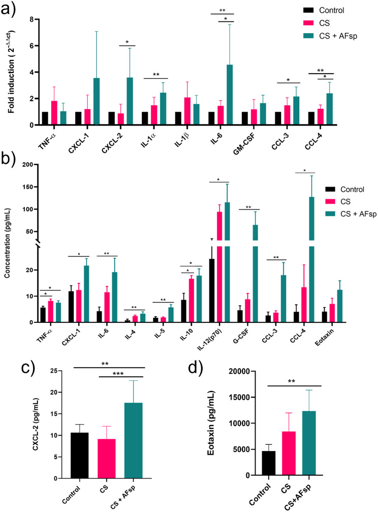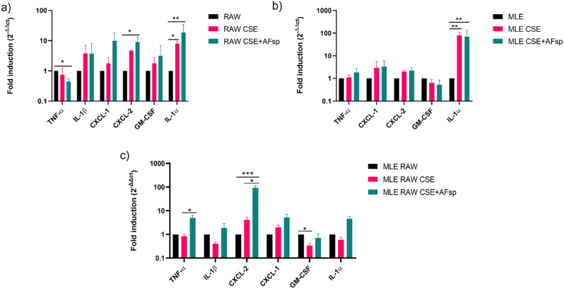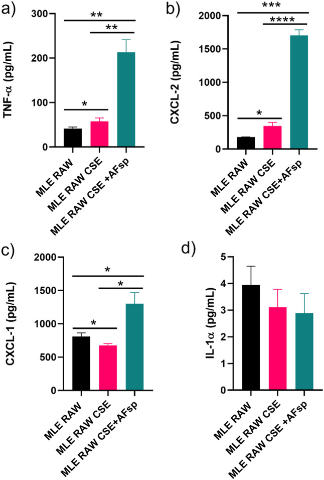 Results: In co-cultures of macrophages and epithelial cells treated with both cigarette smoke extracts (CSE) and A. fumigatus compared to CSE alone there were significant inductions in TNF-α (6.2-fold) and CXCL-2 (21.5-fold) gene expression, confirmed by significant increases in the corresponding protein secretion. In the murine model, histological analyses of the lung after chronic smoke exposure showed an increase in airspace enlargement. Moreover, a Bio-Plex approach on bronchoalveolar lavage of cigarette smoke and A. fumigatus-treated mice showed significant increases in multiple inflammatory proteins secreted in the lung.