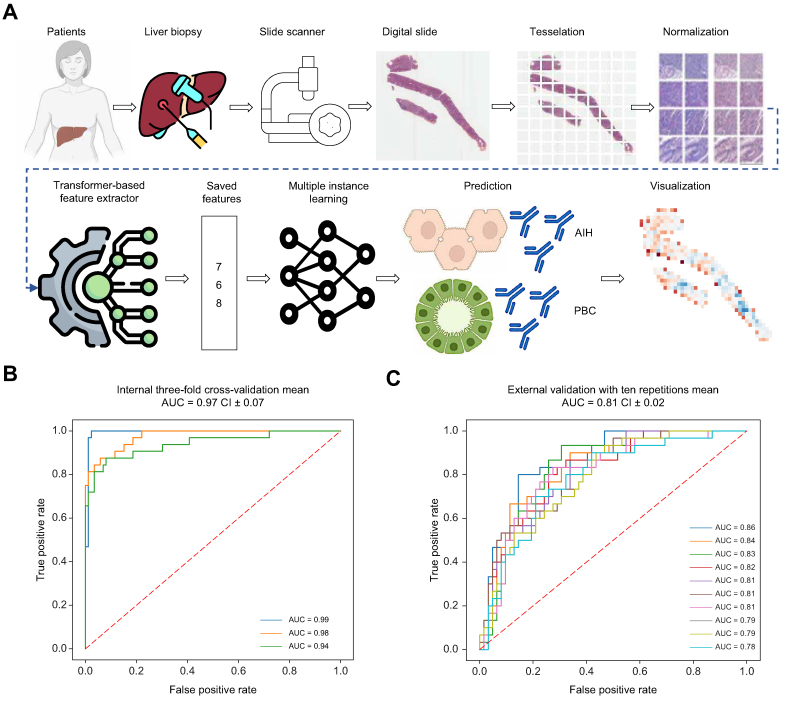Results: The ALNE model demonstrated high accuracy in differentiating AIH from PBC, achieving an area under the receiver operating characteristic curve of 0.81 in external validation. Attention heatmaps showed that ALNE tends to focus more on areas with increased inflammation, associating such patterns predominantly with AIH. A multivariate explainable ML model revealed that PBC cases misclassified as AIH more often had ALP values between 1 × upper limit of normal (ULN) and 2 × ULN, coupled with AST values above 1 × ULN. Inconsistency among general pathologists was noticed when evaluating a random sample of the same cases (Fleiss's kappa value 0.09).