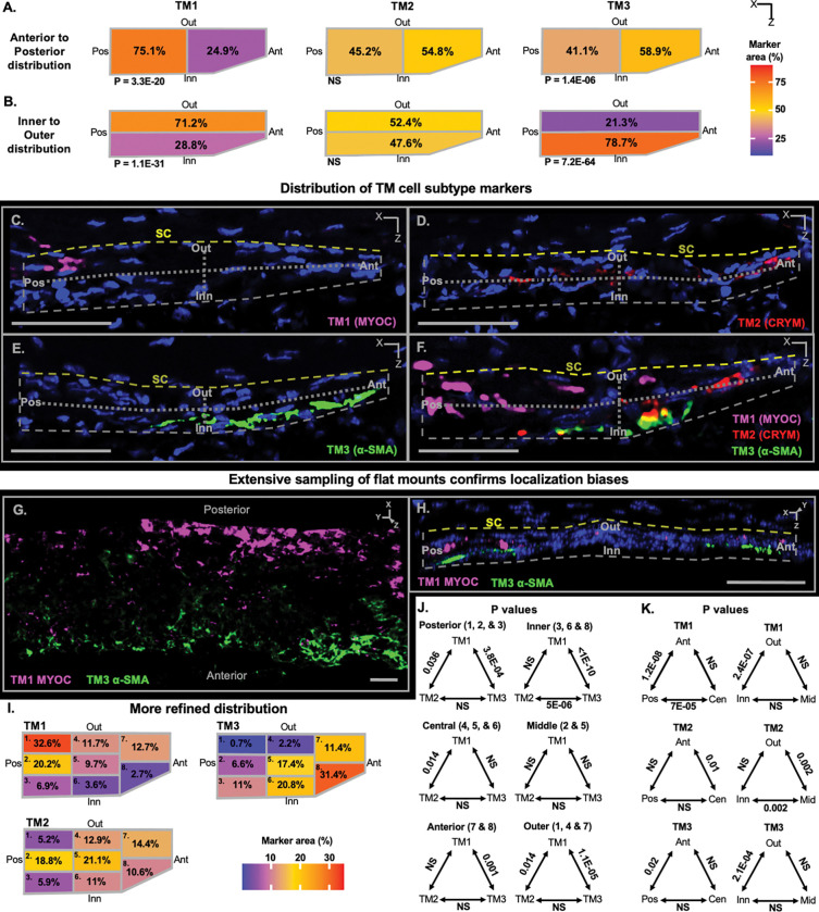 Since the trabecular meshwork (TM) is central to intraocular pressure (IOP) regulation and glaucoma, a deeper understanding of its genomic landscape is needed. We present a multimodal, single-cell resolution analysis of mouse limbal cells (includes TM). In total, we sequenced 9,394 wild-type TM cell transcriptomes. We discovered three TM cell subtypes with characteristic signature genes validated by immunofluorescence on tissue sections and whole-mounts. The subtypes are robust, being detected in datasets for two diverse mouse strains and in independent data from two institutions. Results show compartmentalized enrichment of critical pathways in specific TM cell subtypes. Distinctive signatures include increased expression of genes responsible for 1) extracellular matrix structure and metabolism (TM1 subtype), 2) secreted ligand signaling to support Schlemm's canal cells (TM2), and 3) contractile and mitochondrial/metabolic activity (TM3). ATAC-sequencing data identified active transcription factors in TM cells, including LMX1B. Mutations in LMX1B cause high IOP and glaucoma. LMX1B is emerging as a key transcription factor for normal mitochondrial function and its expression is much higher in TM3 cells than other limbal cells. To understand the role of LMX1B in TM function and glaucoma, we single-cell sequenced limbal cells from Lmx1b V265D/+ mutant mice (2,491 TM cells). In V265D/+ mice, TM3 cells were uniquely affected by pronounced mitochondrial pathway changes. Mitochondria in TM cells of V265D/+ mice are swollen with a reduced cristae area, further supporting a role for mitochondrial dysfunction in the initiation of IOP elevation in these mice. Importantly, treatment with vitamin B3 (nicotinamide), to enhance mitochondrial function and metabolic resilience, significantly protected Lmx1b mutant mice from IOP elevation.