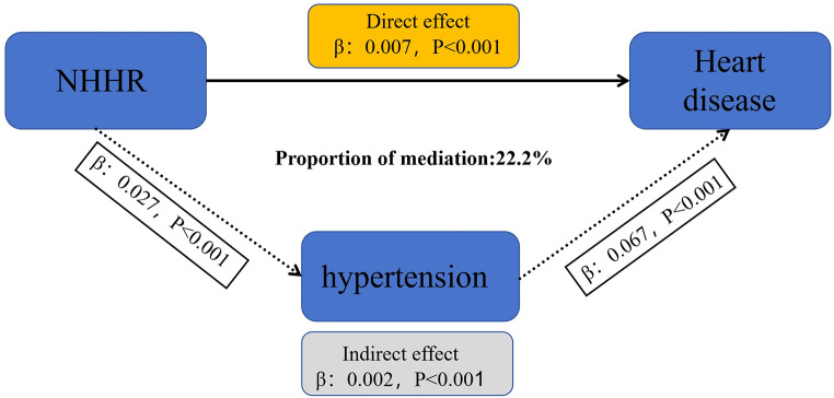 Conclusion: The NHHR was closely associated with an increased risk of developing hypertension and heart diseases. In addition, the NHHR partially mediated the development of heart diseases by promoting hypertension progression. In the prevention and treatment of heart diseases, managing both lipid levels and blood pressure is crucial.