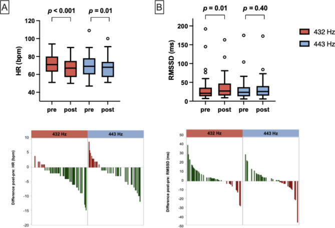 Results: 43 patients (8 male, 35 female) with a median age of 61 years (range 35-86) were included. Both interventions led to a significant reduction in heart rate with a more pronounced effect for 432 Hz (median reduction - 3 bpm (432 Hz) vs. median reduction - 1 bpm (443 Hz), p = 0.04). While heart rate variability was increased exclusively by 432 Hz (median increase + 3 ms, p = 0.01), both vascular resistance (median reduction - 5%, p = 0.008) and stiffness (median reduction %, p = 0.04) were significantly reduced by 432 Hz, which was not observed at 443 Hz. Nevertheless, these effects were not significantly different compared to 443 Hz. On the other hand, 432 Hz led to a reduced pulse wave velocity (median reduction - 0.5 m/s, p < 0.001), which was also significantly different compared to 443 Hz (p < 0.001). Improvement in VAS was observed for both groups, with significant increases in emotional well-being and reduction in fatigue, anxiety and stress for both intervention timepoints, although the majority showed no increased VAS scores even before the intervention (median values 0 for anxiety and stress).