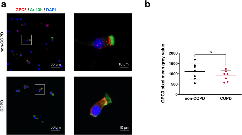 Hedgehog (HH) pathway is involved in pulmonary development and lung homeostasis. It orchestrates airway epithelial cell (AEC) differentiation and contributes to respiratory pathogenesis. The core elements Gli2, Smo, and Shh were found altered in the bronchial epithelium of patients with chronic obstructive pulmonary disease (COPD). Here, we investigated the co-receptors to fully decipher the complex machinery of airway HH pathway activation in health and COPD. The core elements and co-receptors of HH signalling were investigated in lung cell populations using single-cell RNAseq analysis. The transcript levels of the principal co-receptor GPC3 were investigated on public RNAseq datasets and by RT-qPCR. The localisation of GPC3 was evaluated through immunofluorescent stainings on isolated bronchial AEC and tissues from non-COPD and COPD patients. GPC3 pharmacological modulation was achieved with Codrituzumab during AEC differentiation. We demonstrated that the core elements were not abundant in pulmonary cell populations. Focusing on co-receptors, GPC3 was the most expressed transcript in tracheobronchial epithelial cells. The decrease in GPC3 transcript levels correlated with the severity of airway obstrution in COPD patients. Finally, interfering with GPC3 signalling during AEC differentiation induced downregulation of the HH pathway attested by a decrease of Gli2 leading to reduced ciliogenesis and altered mucin production. GPC3 appears as a crucial co-receptor for the HH pathway in the respiratory context. The modulation of GPC3 may represent a novel experimental strategy to tune HH signalling in therapeutic perspectives.