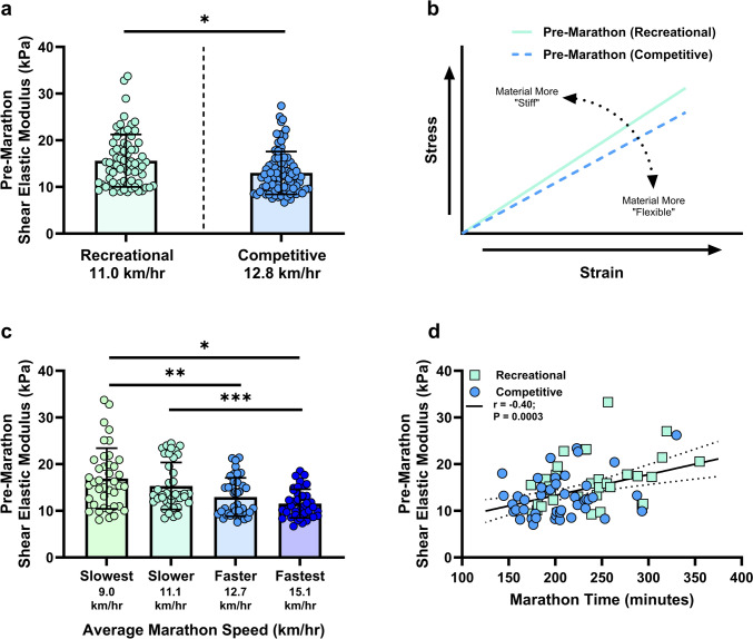 Skeletal muscle shear elastic modulus is a non-invasive surrogate for early detection of muscle damage and soreness consequent to unaccustomed eccentric muscle work. We investigated the influence of marathon distance running on skeletal muscle shear elastic modulus. Shear modulus of the rectus femoris was measured via ultrasound shear wave elastography in 80 participants (30 female, 50 male) before and after running a World Marathon Major. Experience level, muscle soreness and run readiness were surveyed. Pre-marathon shear elastic modulus was lower in competitive vs recreational runners (13.0 ± 4.6 vs 15.6 ± 5.6 kPa; P = 0.0014), lower for fastest vs slowest finish times (11.6 ± 3.0 vs 16.9 ± 6.5 kPa; P = < 0.0001) and associated with marathon finish time (r = - 0.40; P < 0.0003). Marathon running increased shear modulus (~ 23%), irrespective of experience, sex or course, but was blunted in runners wearing highly cushioned footwear with plates who had matched finish times (Other = ~ 31% vs Vaporfly = ~ 17%). Muscle soreness was strongly associated with run readiness (R2 = 0.995; P = 0.0026), and marathon recovery time was longer in runners with greater increases in marathon-mediated shear modulus. Skeletal muscle elastic modulus may reflect both short- and long-term muscle adaptation as a function of marathon running, or factors occurring before or after a marathon itself, such as exercise capacity or recovery time. These data are consistent with marathon-mediated muscle damage and soreness, but equally highlight a possibility to monitor and modulate outcomes in favor of a runner.