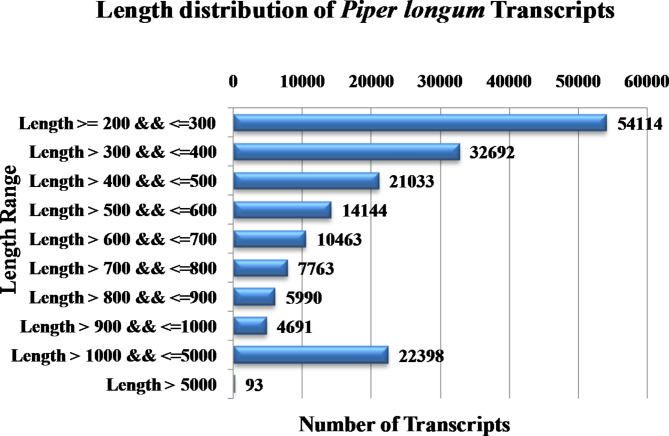 Piper longum, commonly known as long pepper, is highly valued for its bioactive alkaloid piperine, which has diverse pharmaceutical and culinary applications. In this study, we used high-throughput sequencing and de novo transcriptome assembly to analyze the transcriptomes of P. longum leaves, roots, and spikes. Our dataset consisted of 173,381 high-quality transcripts, with functional annotations highlighting key pathways involved in lysine biosynthesis and secondary metabolite production. We identified 8041 simple sequence repeats (SSRs), primarily trinucleotide repeats, adding valuable genetic markers. Additionally, we uncovered 21,235 transcription factors (TFs) across 65 families, including bHLH, NAC, and MYB, which are essential in regulating metabolism. KEGG pathway analysis categorized 4730 transcripts into 377 pathways, focusing on piperine biosynthesis, including phenylpropanoid and L-lysine metabolism. Our research identified 14 expressed genes encoding enzymes crucial for tropane, piperidine, and pyridine alkaloid biosynthesis, shedding light on piperine production mechanisms. High-performance liquid chromatography (HPLC) revealed varying piperine concentrations, with spikes showing the highest content, followed by roots and leaves. This comprehensive analysis of the P. longum transcriptome offers valuable insights into the genetics and regulatory networks underlying piperine biosynthesis, identifying molecular markers and genes that hold significant potential for enhancing the plant's biological and pharmaceutical applications.