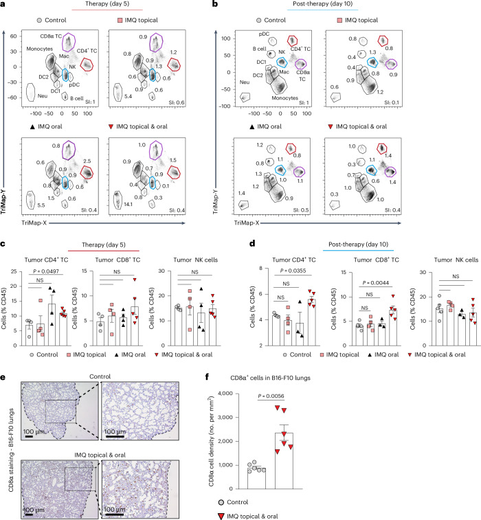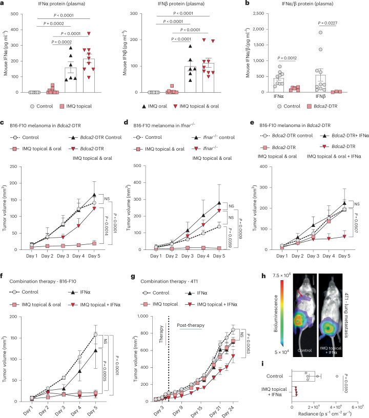 Dendritic cell (DC) activation by pattern recognition receptors like Toll-like-receptors (TLRs) is crucial for cancer immunotherapies. Here, we demonstrate the effectiveness of the TLR7/8 agonist imiquimod (IMQ) in treating both local tumors and distant metastases. Administered orally, IMQ activates plasmacytoid DCs (pDCs) to produce systemic type I interferons (IFN-I) required for TLR7/8 upregulation in DCs and macrophages, sensitizing them to topical IMQ treatment, which is essential for therapeutic efficacy. The mechanism involves c-Jun/AP-1 mediating TLR7/8 signaling in IFN-I-primed DCs, upregulating the pDC-recruiting chemokine CCL2 and the anti-angiogenic cytokine interleukin-12, which suppresses VEGF-A production leading to tumor necrosis and regression. Combining topical and systemic IMQ or IFN-I generates a CD8+ T cell-dependent response at metastatic sites, reinforced by PD-1 blockade, leading to long-lasting memory. Analysis of cohorts of patients with melanoma demonstrates DC-specific TLR7/8 upregulation by IFN-I, supporting the translational potential of combining systemic IFN-I and topical IMQ to improve immunotherapy of topically accessible tumors.
