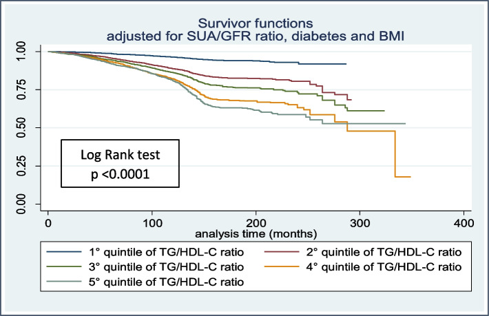 Results: After a mean follow-up of 124 ± 64 months, 2,665 (14.2%) CV deaths occurred. The incidence of fatal and non-fatal CV events increased in parallel with the increase of TG/HDL-C quintiles. TG/HDL-C ratio showed a positive association with increasing of SUA/GFR ratio, even in non-diabetic patients. Multivariate analysis showed that the TG/HDL-C ratio increases the mortality risk even after adjustment for potential confounding factors. Finally, IR and GFR-adjusted hyperuricemia showed an additive effect on CV mortality.