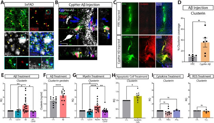 Results: We found that phagocytosis of debris such as amyloid beta, myelin, and apoptotic cells, increases clusterin expression in oligodendrocyte progenitors. We further discovered that exposure to clusterin inhibits differentiation of oligodendrocyte progenitors. Mechanistically, clusterin blunts production of IL-9 and addition of exogenous IL-9 can rescue clusterin-inhibited myelination. Lastly, we demonstrate that clusterin deletion in mice prevents myelin loss in the 5XFAD model.