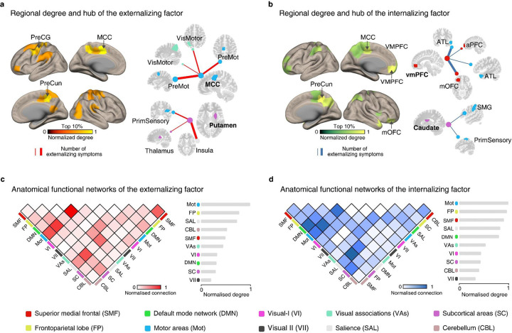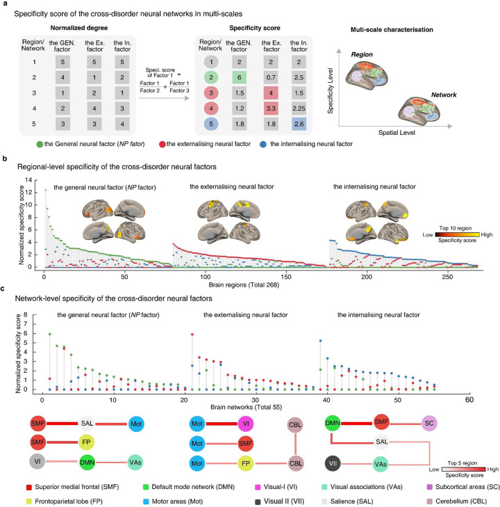 Mounting evidence suggests hierarchical psychopathology factors underlying psychiatric comorbidity. However, the exact neurobiological characterizations of these multilevel factors remain elusive. In this study, leveraging the brain-behavior predictive framework with a 10-year longitudinal imaging-genetic cohort (IMAGEN, ages 14, 19 and 23, N = 1,750), we constructed two neural factors underlying externalizing and internalizing symptoms, which were reproducible across six clinical and population-based datasets (ABCD, STRATIFY/ESTRA, ABIDE II, ADHD-200 and XiNan, from age 10 to age 36, N = 3,765). These two neural factors exhibit distinct neural configurations: hyperconnectivity in impulsivity-related circuits for the externalizing symptoms and hypoconnectivity in goal-directed circuits for the internalizing symptoms. Both factors also differ in their cognitive-behavior relevance, genetic substrates and developmental profiles. Together with previous studies, these findings propose a hierarchical neurocognitive spectral model of comorbid mental illnesses from preadolescence to adulthood: a general neuropsychopathological (NP) factor (manifested as inefficient executive control) and two stratified factors for externalizing (deficient inhibition control) and internalizing (impaired goal-directed function) symptoms, respectively. These holistic insights are crucial for the development of stratified therapeutic interventions for mental disorders.