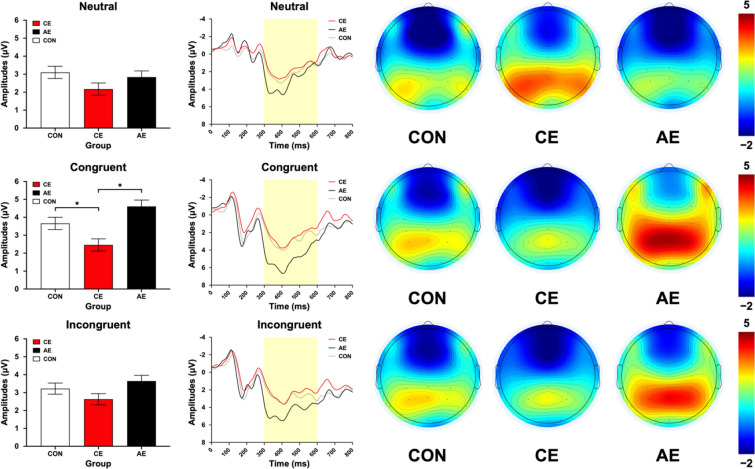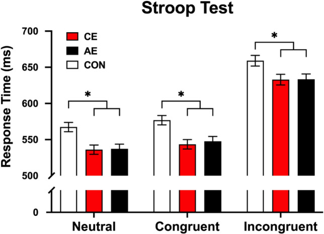 Methods: Seventy-eight adults (mean age = 22.95, SD = 1.75 years) were randomly assigned to either a CE, AE, or control (CON) group. Participants in the CE group engaged in 12-min of AE (40-59% of heart rate reserve [HRR]) coupled with 13-min of RE (1 set, with 75% of 10-repetition maximum, and 12 repetitions of 8 movements). The AE group participated in 25 min of AE (40-59% HRR). Prior to and following exercise onset, participants in both the CE and AE groups completed a 5-min warm-up and cool-down. Participants in the CON group read books for 35 min. Lactate concentrations were measured at timepoints of 0-, 17-, and 30-min relative to the treatment onset. Response time (RT) and accuracy in the Stroop test, as well as P3 amplitude, were assessed before and after the treatment.