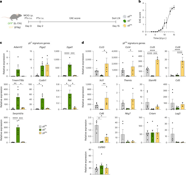 γδ T cells producing either interleukin-17A (γδ17 cells) or interferon-γ (γδIFN cells) are generated in the mouse thymus, but the molecular regulators of their peripheral functions are not fully characterized. Here we established an Il17a-GFP:Ifng-YFP double-reporter mouse strain to analyze at unprecedented depth the transcriptomes of pure γδ17 cell versus γδIFN cell populations from peripheral lymph nodes. Within a very high fraction of differentially expressed genes, we identify a panel of 20 new signature genes in steady-state γδ17 cells versus γδIFN cells, which we further validate in models of experimental autoimmune encephalomyelitis and cerebral malaria, respectively. Among the signature genes, we show that the co-receptor CD6 and the signaling protein Themis promote the activation and proliferation of peripheral γδIFN cells in response to T cell antigen receptor stimulation in vitro and to Plasmodium infection in vivo. This resource can help to understand the distinct activities of effector γδ T cell subsets in pathophysiology.