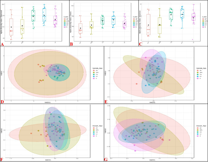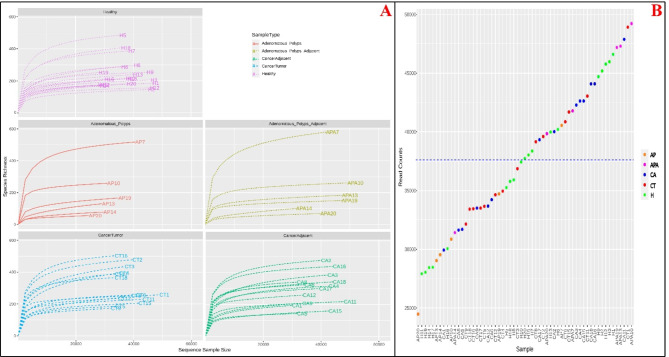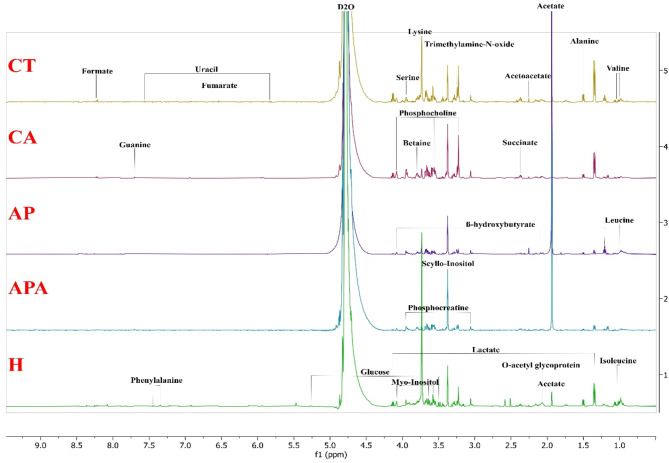 Methods: Sixty samples including healthy (H), adenomatous polyps (AP), adenomatous polyps-adjacent (APA), cancer tumor (CT), and cancer tumor-adjacent (CA) tissues were collected and analyzed by 16 S rRNA sequencing and 1H NMR spectroscopy.