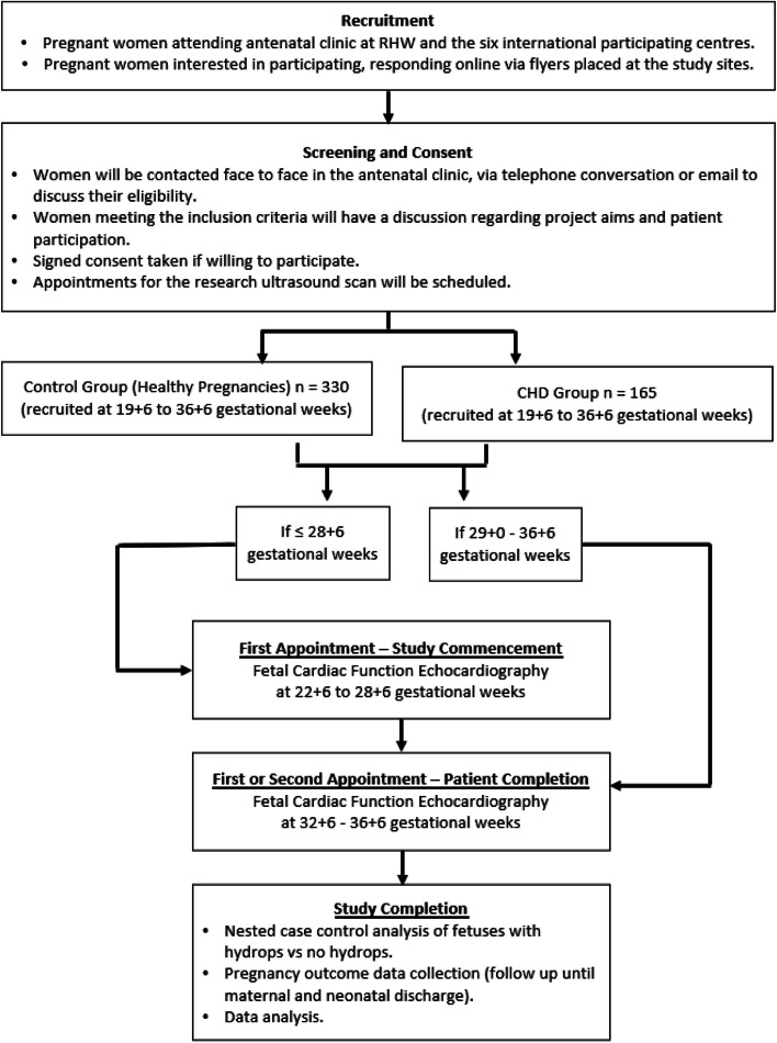 Methods: A multicenter cohort study will be carried out in eight teaching hospitals across Europe, Australia, and Middle East. Based on a previous observed standard deviation, a total sample of 381 pregnancies is required to achieve 80% power to detect a difference of 0.03 in mean myocardial performance index (MPI) with a two-sided type I error rate of 5%. After adjustments allowing for patient exclusions or incomplete datasets, a total of 330 healthy singleton pregnancies and 165 diagnosed with CHD will be recruited. Two fetal cardiac function evaluations at 19 + 6-28 + 6 and 32 + 6-36 + 6 weeks will be offered assessing automated pulsed wave doppler (PWD) MPI, spatio-temporal image correlation (STIC) annular and septal plane excursion (TAPSE, MAPSE and SAPSE), alongside cardiac morphometric and Doppler evaluations of flow across the valves. A secondary nested case-control study will evaluate fetuses with hydrops compared to those without. Differences in functional parameters between cases and controls and over time will be assessed using generalized linear mixed models. Logistic regression will estimate the association between cardiac parameters and hydrops' incidence.