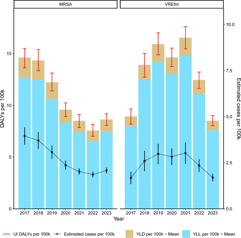 Results: From 2017 to 2023, 6262 MRSA and 5442 VREfm blood culture-positive isolates were identified. The incidence of MRSA bloodstream infections decreased from 4.0 to 2.1 per 100,000 population, with estimated DALYs decreasing from 14.6 to 8.6 per 100,000 and attributable deaths from 591 to 316. Conversely, VREfm-BSI incidence doubled from 1.7 to a peak of 3.0 (2021) before declining back to 1.7 per 100,000 in 2023, with estimated DALYs increasing from 8.9 to 16.5 and then decreasing to 8.5 per 100,000 and attributable deaths increasing from 317 to 327. Men and people over 60 years had the highest burden, with noticeable regional differences.