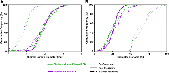 Results: The 6-month in-lesion late lumen loss was 0.06 ± 0.38 mm with shellac and vitamin E-based PCB vs 0.09 ± 0.36 mm with reference PCB. The 1-sided 97.5% upper confidence limit of the difference was 0.08 mm, which was lower than the noninferiority limit of 0.15 mm, achieving noninferiority (P for noninferiority = 0.001). There was comparable late lumen enlargement (44.7% vs 42.7%; P = 0.903) and binary restenosis rates (3.2% vs 6.7%; P = 0.442) following treatment with shellac and vitamin E-based PCB and reference PCB, respectively. Both PCBs had similar 12-month rates of target vessel failure (3.0% in shellac and vitamin E-based PCB vs 4.3% in reference PCB; P = 0.921).