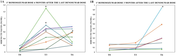 Methods: This prospective, single-center cohort study included 39 post-menopausal women with osteoporosis experiencing either MOFs or decrease in bone mineral density during long-term treatment with anti-resorptive drugs. Eighteen received romosozumab either 6 months (Group A) or 3 months (Group B) after their last denosumab dose, while 21 women switched from bisphosphonates to romosozumab and were enrolled as controls (Group C). Serum C-terminal telopeptide of type I collagen (CTX) levels were measured at baseline, 3 and 6 months.