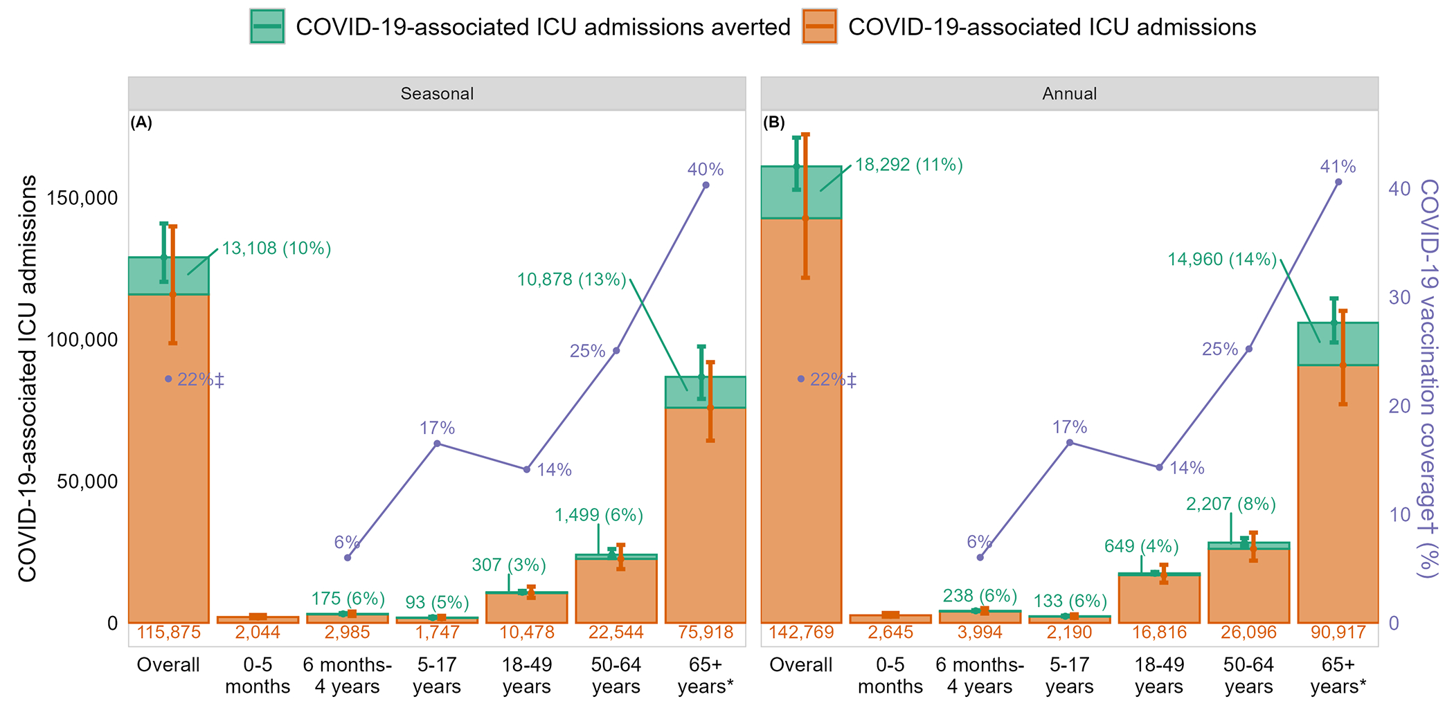 COVID-19-associated hospitalizations, ICU admissions, and in-hospital deaths averted from 2023 to 2024 COVID-19 vaccination from the weeks of October 1, 2023, through April 21, 2024, were estimated via a novel multiplier model that utilized causal inference, conditional probabilities of hospitalization, and correlations between data elements in Monte Carlo simulations. Median COVID-19-associated hospitalizations averted were 68,315 (95 % uncertainty interval [UI] 42,831-97,984), ICU admissions averted were 13,108 (95 % UI 4459-25,042), and in-hospital deaths averted were 5301 (95 % UI 101-14,230). Averted COVID-19-associated burden was highest in adults aged 65 years and older (hospitalizations averted 57,665, 95 % UI 35,442-84,006; ICU admissions averted 10,878, 95 % UI 3104-21,591; in-hospital deaths averted 4779, 95 % UI 0-13,132). Expanding the analytic period to comprise the weeks of September 24, 2023, through August 11, 2024, resulted in 107,197 COVID-19-associated hospitalizations averted (95 % UI 80,692-137,643), 18,292 COVID-19-associated ICU admissions averted (95 % UI 10,062-28,436), and 6749 COVID-19-associated in-hospital deaths averted (95 % UI 2077-13,557). Older adults had the highest COVID-19-associated averted burden and potential to reduce burden further through increased vaccine coverage. 2023-2024 COVID-19 vaccinations reduced the burden of COVID-19-associated severe disease.