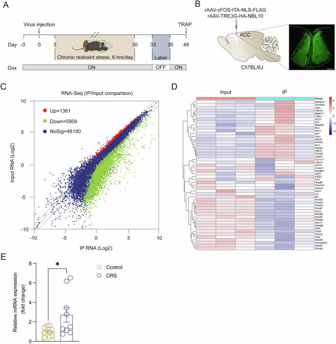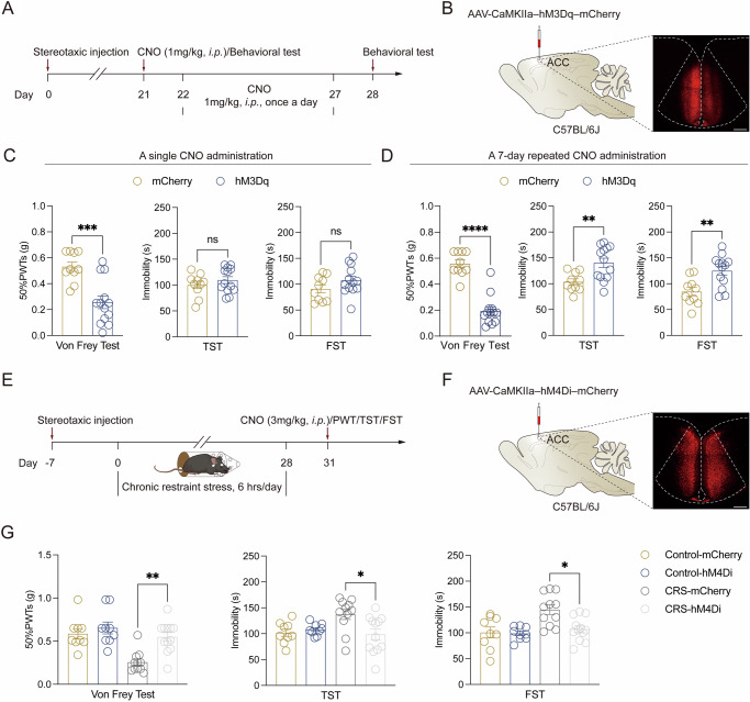 Depression and comorbid pain are frequently encountered clinically, and the comorbidity complicates the overall medical management. However, the mechanism whereby depression triggers development of pain needs to be further elucidated. Here, by using the chronic restraint stress (CRS) mouse model of depression and comorbid pain, we showed that CRS hyperactivated the glutamatergic neurons in the anterior cingulate cortex (ACC), as well as increasing the dendrite complexity and number. Chemogenetic activation of these neurons can induce depression and pain, while chemogenetic blockade can reverse such depression-induced pain. Moreover, we utilized translating ribosome affinity purification (TRAP) in combination with c-Fos-tTA strategy and pharmacological approaches and identified SIGMAR1 as a potential therapeutic molecular target. These results revealed a previously unknown neural mechanism for depression and pain comorbidity and provided new mechanistic insights into the antidepressive and analgesic effects of the disease.
