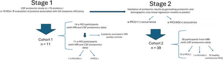 Results: A total of seven different proteins were significantly associated with GS health (p-value < 6.4 × 10-4). The stronger correlations were identified for NSUN6, GRAAK, OLFML3, ACTN2, RUXF, SHPS1 and TIM-4. A pathway enrichment analysis revealed that the proteins associated with GS health were mainly implicated in neurodegenerative processes, immunity and inflammation. In Stage 2, we validated these proteomic results in a new cohort of aMCI participants (with and without evidence of AD pathology in CSF (aMCI(-) and aMCI/AD( +); n = 22 and 7, respectively) and healthy controls (n = 10). Proteomic prediction models were generated in each ROI. These were compared with demographic-only models for identifying participants with aMCI(-) and aMCI/AD( +) vs controls. This analysis was repeated to determine if the models could identify those with aMCI/AD( +) from both aMCI(-) and controls. The proteomic models were found to outperform the demographic-only models.