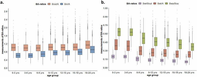 Compliance with ethical standards. Guarantor: The scientific guarantor of this publication is Dr. Pierluigi Ciet. Conflict of interest: The author of this manuscript, Harm Tiddens, declares relationships with the following companies: Insmed, TBIO, Thirona, Neupharma and Boehringer. The author of this manuscript, Jean-Paul Charbonnier, declares relationships with Thirona. Daan Caudri is director of the Erasmus MC-LungAnalysis laboratory. The author of this manuscript, Pierluigi Ciet, declares relationships with the following companies: Vertex Pharmaceutical, Chiesi Pharmaceuticals, and Siemens Healthineers. Wieying Kuo is affiliated with Voiant Clinical. The rest of the authors of this manuscript declare no relationships with any companies, whose products or services may be related to the subject matter of the article. Statistics and biometry: One of the authors, Eleni-Rosalina Andrinopoulou, has significant statistical expertise. Informed consent: Written informed consent was not required for this study because this is a retrospective study. Ethical approval: Institutional Review Board approval was obtained. Study subjects or cohorts overlap: The cohort has been previously reported in Kuo et al [6]. In the previous study, the dataset consisted of 294 out of 1160 chest CT scans of children and adolescents were collected retrospectively by the international multicenter Normal Chest CT Study Group. The previous study aimed to define normative data on central airway dimensions, in particular trachea, right main bronchi, and left main bronchi, in chest CT of children. On these 294 inspiratory CT scans, central airways were semi-automatically analyzed using Myrian XP-Lung software (version 1.19.1, Intrasense). The intrathoracic tracheal length was measured from the carina to the thorax inlet manually. In the recent study, the dataset consisted of 375 out of 1160 chest CT scans of children and young adults. The primary aim of the current study is to establish normative data for the dimensions of peripheral airways extending down to the 6th bronchial generation, in chest CT of children. On these 375 inspiratory CT scans, bronchi and adjacent pulmonary arteries were automatically analyzed using LungQ (version 2.0.1, Thirona). Using this algorithm, we computed the following bronchus and artery parameters from segmental bronchi to the most peripheral detectable bronchi: bronchial outer diameter (Bout), bronchial inner diameter (Bin), adjacent pulmonary artery diameter (A), bronchial wall thickness (Bwt), bronchial wall area (BWA), and bronchial outer area (BOA). From these parameters, we computed the following ratios: Bout/A, Bin/A, Bwt/A, Bwt/Bout, and BWA/BOA. Furthermore, mean lung density, total lung volume, and the square root of wall area of bronchi with a 10-mm lumen perimeter (Pi10) were obtained by using another module from the same software package. Methodology: Retrospective Observational Multicenter study