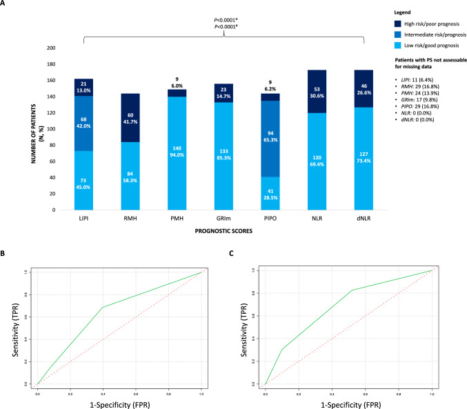 Methods: Overall 173 adult patients with metastatic solid tumors candidates to ICI in clinical trials at our Institution were prospectively recruited. Blood samples were collected at cycle 1 (C1D1) and 2 (C2D1) and until the occurrence of progressive disease (PD). C1D1 LIPI, RMH, PMHI, NLR, dNLR, PIPO and GRIm prognostic scores were calculated. The primary endpoint was identifying the best score to predict rapid PD (≤ 4 months) with ICI using logistic regressions accounting for tumor type, and receiving operators characteristics (ROC) with area under curve (AUC), accompanied by an extensive comparison of the score performances in the prediction of overall survival (OS), progression-free survival (PFS), overall response rates (ORR) and durable clinical benefit (DCB). Secondary objectives included describing study cohort outcomes and studying the association between the selected score at C1D1, C2D1 and its dynamics with OS and PFS.
