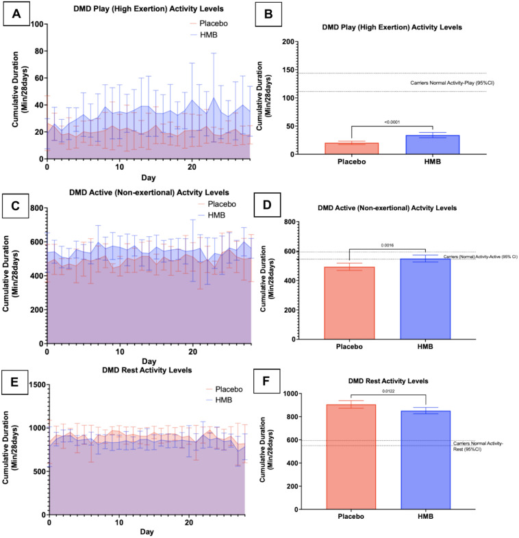 Duchenne muscular dystrophy (DMD) is a severe neuromuscular disease due to loss of dystrophin, leading to progressive muscle wasting and physical inactivity. In this pilot study, we studied the effect of daily supplementation of the anabolic substrate beta-hydroxy-beta-methylbutyrate (HMB) on whole body protein and amino acid kinetics using novel isotope methods and daily activity in a canine model of DMD. Six DMD dogs were administered 3 g daily of HMB or placebo for 28 days according to a randomized, placebo-controlled, double-blinded crossover design. We measured pre- and post-intervention daily activity, biochemistry markers, and whole-body amino acid kinetics. We tracked daily activity with an activity monitoring device and measured plasma creatine kinase and standard clinical biochemistry panels to monitor muscle and organ function. To calculate whole body and intracellular amino acid production, we administered in the postabsorptive state an IV stable isotope solution containing 20 amino acid tracers. We collected blood before and six times after until two hours post tracer pulse administration and measured amino acid enrichments and concentrations by LC-MS/MS, subsequently followed by (non) compartmental modeling of the decay enrichment curves. Results were expressed as mean with 95% CI. Whole body production, plasma concentrations, and intra-/extracellular compartmental analyses of various amino acids were attenuated in HMB-dosed DMD dogs. Specifically, the plasma concentration of hydroxyproline (marker of collagen breakdown) was significantly higher in the placebo group compared to the HMB group. The intra- and extracellular pool sizes and flux between the two compartments of hydroxyproline was reduced in HMB treated dogs. DMD dogs treated with HMB as compared to placebo had a respective 40% increase in exertional (play) (951 [827, 1075] versus 569 [491, 647]; p < 0.0001) and 10.5% increase in non-exertional (active) activity (15,366 [14742, 15990] versus 13,806 [13148,14466]; p = 0.0016). In addition, a 6% reduction was found in rest time after HMB supplementation compared to placebo (23,857 [23,130, 24,584], versus 25,363 [24500, 26225]; p = 0.0122). Creatine kinase was not statistically different between groups. We did not observe any adverse clinical or biochemical-related effects of HMB dosing. Daily HMB supplementation in DMD dogs can safely and positively influence protein and amino acid metabolism and improve overall daily activity.