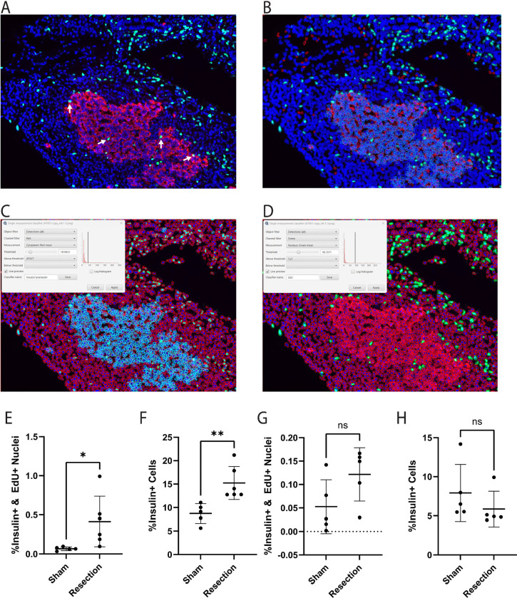 Results: Here we show a comprehensive histological assessment of pancreatic islets in axolotl. Following pancreatic injury, no apparent blastemal structure was observed. We found a significant, organ-wide increase in cellular proliferation post-resection in the pancreas compared to sham-operated controls. This proliferative response was most robust at the site of injury. We found that β-cells actively contributed to the increased rates of proliferation upon injury. β-cell proliferation manifested in increased β-cell mass in injured tissue at two weeks post injury. At four weeks post injury, we found organ-wide proliferation to be extinguished while proliferation at the injury site persisted, corresponding to pancreatic tissue recovery. Similarly, total β-cell mass was comparable to sham after four weeks.