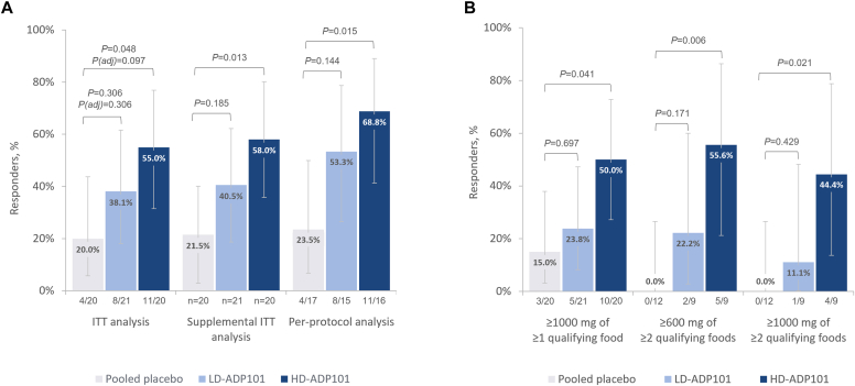 Methods: Participants were randomized to low-dose (1500 mg/d; 100 mg protein per food) or high-dose (4500 mg/d; 300 mg protein per food) ADP101, or matched placebo, with dose escalation followed by daily maintenance dosing over 40 weeks. The primary endpoint was the proportion of participants tolerating a ≥600 mg challenge dose of a single qualifying food without dose-limiting symptoms at the Week 40 Exit DBPCFC (ie, responders).