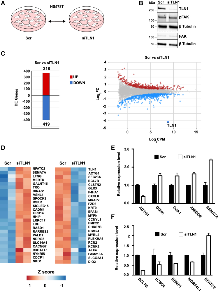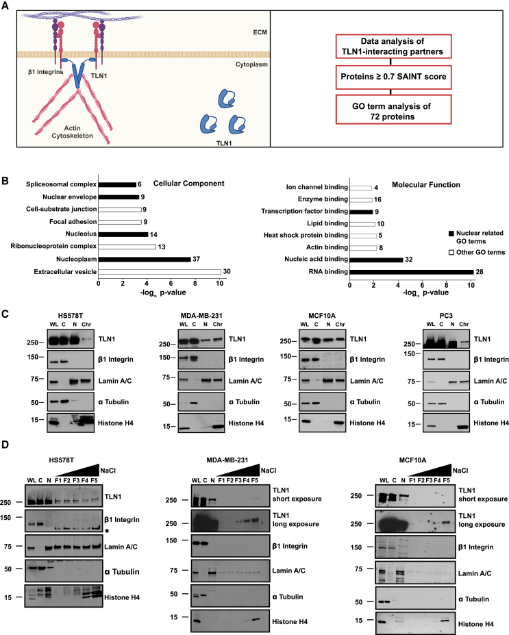 Talin-1 (TLN1) is best known to activate integrin receptors and transmit mechanical stimuli to the actin cytoskeleton at focal adhesions. However, the localization of TLN1 is not restricted to focal adhesions. By utilizing both subcellular fractionations and confocal microscopy analyses, we show that TLN1 localizes to the nucleus in several human cell lines, where it is tightly associated with the chromatin. Importantly, small interfering RNA (siRNA)-mediated depletion of endogenous TLN1 triggers extensive changes in the gene expression profile of human breast epithelial cells. To determine the functional impact of nuclear TLN1, we expressed a TLN1 fusion protein containing a nuclear localization signal. Our findings revealed that the accumulation of nuclear TLN1 alters the expression of a subset of genes and impairs the formation of cell-cell clusters. This study introduces an additional perspective on the canonical view of TLN1 subcellular localization and function.