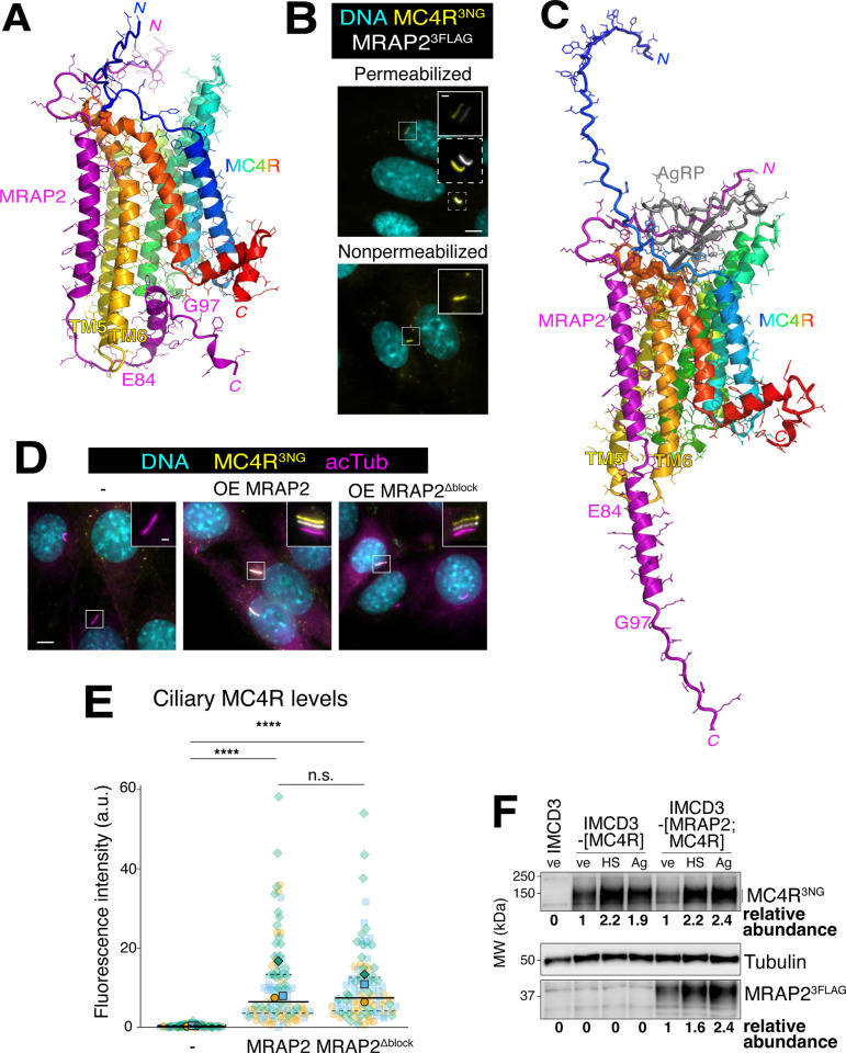 The G protein-coupled receptor (GPCR) melanocortin receptor 4 (MC4R) is an essential regulator of body weight homeostasis. MC4R is unusual among GPCRs in that its activity is regulated by 2 opposing physiological ligands, the agonist ⍺-MSH and the antagonist/inverse agonist AgRP. Paradoxically, while MC4R localizes and functions at the cilium of hypothalamic neurons, the ciliary levels of MC4R are very low under unrestricted feeding conditions. Here, we find that the constitutive activity of MC4R is responsible for the continuous depletion of MC4R from cilia and that inhibition of MC4R's activity via AgRP leads to a robust accumulation of MC4R in cilia. Ciliary targeting of MC4R is mediated by its partner MRAP2 and the constitutive exit of MC4R from cilia relies on the sensor of activation β-arrestin, on ubiquitination, and on the BBSome ciliary trafficking complex. Thus, while MC4R exits cilia via conventional mechanisms, it only accumulates in cilia when its activity is suppressed by AgRP.
