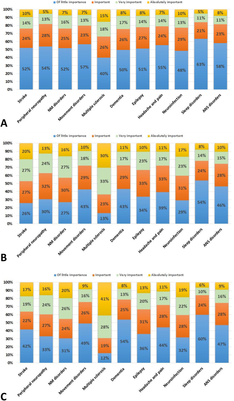 Results: We obtained 616 responses from 84 countries, predominantly from Europe. In the view of the treating neurologist, patients with multiple sclerosis (MS), neuroimmunological disorders (ND), and chronic neurological infections continued to have high levels of skepticism toward SARS-CoV-2 vaccination. Patients with MS/ND were quoted as the most hesitant group, with 60% of the respondents sharing this impression. The patient group perceived as most confident towards immunization against COVID-19 and with the lowest level of distrust towards the vaccine were those with sleep disorders. For all other conditions, perceived distrust ranged between 42 and 52%. Fear of adverse events of vaccination or disease reactivation was perceived by 87% of patients with MS/ND and more than 70% of patients with stroke/vascular neurology, neuromuscular disorders, chronic neurological infections, and peripheral neuropathy. Patients with sleep disorders (54%), autonomic disorders (46%), movement disorders (43%), and dementia (43%) were sensed as less fearful of vaccine-related adverse events.