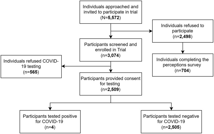 Access, demand, and acceptance of coronavirus disease 2019 (COVID-19) testing have varied globally. This study explored the sociodemographic and psychosocial risk factors that contribute to the uptake of COVID-19 testing in community settings in South Africa. This paper presents a cross-sectional secondary analysis using data from a cluster randomized controlled trial and a nested perception survey of COVID-19 antigen testing in communities located in urban (eThekwini, KwaZulu-Natal) and rural settings (Worcester, Eastern Cape) in South Africa. Individuals who were reluctant to get tested participated in the perception survey. Data were analyzed using descriptive statistics and multivariable logistic regression to assess linear associations and estimate adjusted odds ratios (ORs). The analysis was conducted on 3,074 individuals, of whom 2,509 (81.6%) provided consent for COVID-19 testing. Among those, 2,505 (81.5%) tested negative, and 4 (0.1%) tested positive for COVID-19. The mean age of participants was 38 (SD = 14.61), and 57% were male. Females (OR: 1.27; 95% CI = 1-1.6), individuals older than 56 years (OR: 1.95; 95% CI = 1.24-3.07), and those who were vaccinated (OR: 1.99; 95% CI = 1.53-2.60) were more likely to consent. Individuals who had previously tested positive for severe acute respiratory syndrome coronavirus 2 were less likely to consent to testing (OR: 0.64; 95% CI = 0.11-0.46). No link was found between depression, anxiety, substance use, and willingness to undergo COVID-19 testing. A perceptions survey involving 704 participants, which explored factors influencing testing willingness, found that older adults, and urban populations were less likely to undergo COVID-19 testing. Targeted health campaigns may improve testing rates. Larger-scale implementation research is required to explore best practices for improving testing rates and confidence in population-level detection within South Africa.