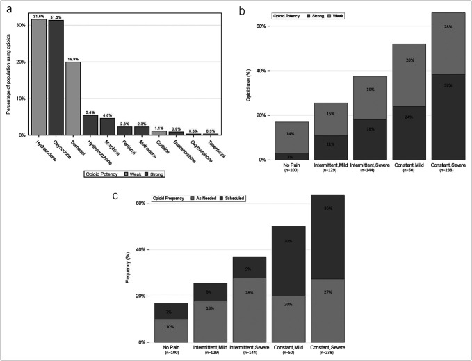 Results: A total of 681 participants (n = 364, 53% male) were included: 299 (44%) were current opioid users (22% only weak opioids and 22% at least 1 strong opioid). Increasing frequency and severity of pain was associated with increase of weak, strong, as-needed, or scheduled opioids. Neuromodulators were used by ∼40% of participants; increasing use was associated with increasing frequency and severity of pain. On multivariate analysis, independent predictors associated with strength and frequency of current opioid use were pain patterns (odds ratios [ORs] 1.84-8.32 and ORs 1.92-8.52, respectively, P < 0.001) and prior celiac plexus block (OR 3.54, 95% confidence intervals 1.82-6.87 and OR 3.42, 95% confidence intervals 1.76-6.64, respectively). Participants using opioids had higher prevalence of disability, healthcare utilization, and poorer quality of life.