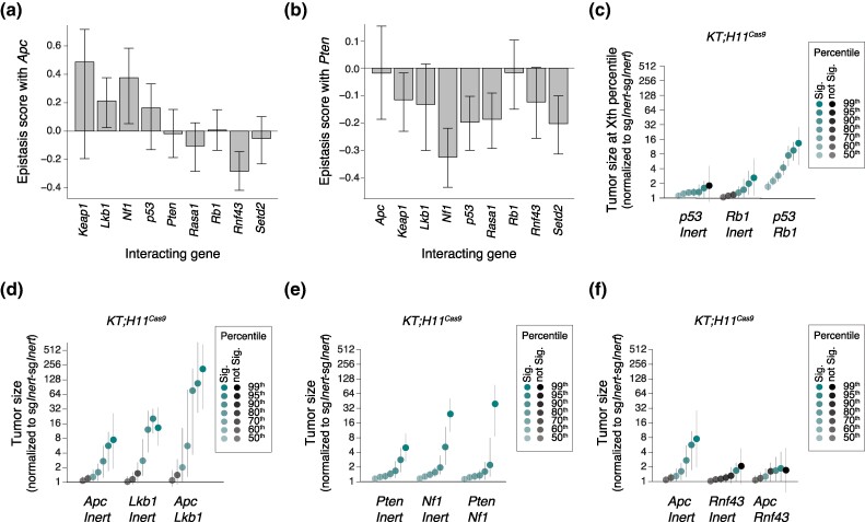 Lung adenocarcinoma, the most common subtype of lung cancer, is genomically complex, with tumors containing tens to hundreds of non-synonymous mutations. However, little is understood about how genes interact with each other to enable the evolution of cancer in vivo, largely due to a lack of methods for investigating genetic interactions in a high-throughput and quantitative manner. Here, we employed a novel platform to generate tumors with inactivation of pairs of ten diverse tumor suppressor genes within an autochthonous mouse model of oncogenic KRAS-driven lung cancer. By quantifying the fitness of tumors with every single and double mutant genotype, we show that most tumor suppressor genetic interactions exhibited negative epistasis, with diminishing returns on tumor fitness. In contrast, Apc inactivation showed positive epistasis with the inactivation of several other genes, including synergistic effects on tumor fitness in combination with Lkb1 or Nf1 inactivation. Sign epistasis was extremely rare, suggesting a surprisingly accessible fitness landscape during lung tumorigenesis. These findings expand our understanding of the interactions that drive tumorigenesis in vivo.