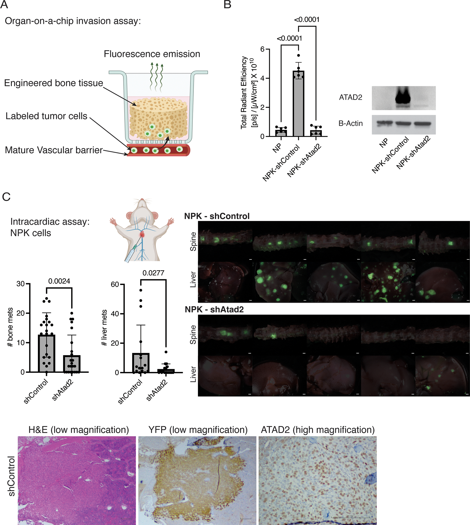 Metastasis accounts for the overwhelming majority of cancer deaths. In prostate cancer and many other solid tumors, progression to metastasis is associated with drastically reduced survival outcomes, yet the mechanisms behind this progression remain largely unknown. ATPase family AAA domain containing 2 (ATAD2) is an epigenetic reader of acetylated histones that is overexpressed in multiple cancer types and usually associated with poor patient outcomes. However, the functional role of ATAD2 in cancer progression and metastasis has been relatively understudied. Here, we employ genetically engineered mouse models of prostate cancer bone metastasis, as well as multiple independent human cohorts, to show that ATAD2 is highly enriched in bone metastasis compared with primary tumors and significantly associated with the development of metastasis. We show that ATAD2 expression is associated with MYC pathway activation in patient datasets and that, at least in a subset of tumors, MYC and ATAD2 can regulate each other's expression. Using functional studies on mouse bone metastatic cell lines and innovative organ-on-a-chip bone invasion assays, we establish a functional role for ATAD2 inhibition in reducing prostate cancer metastasis and growth in bone. Implications: Our study highlights ATAD2 as a driver of prostate cancer progression and metastasis and suggests it may constitute a promising novel therapeutic target.