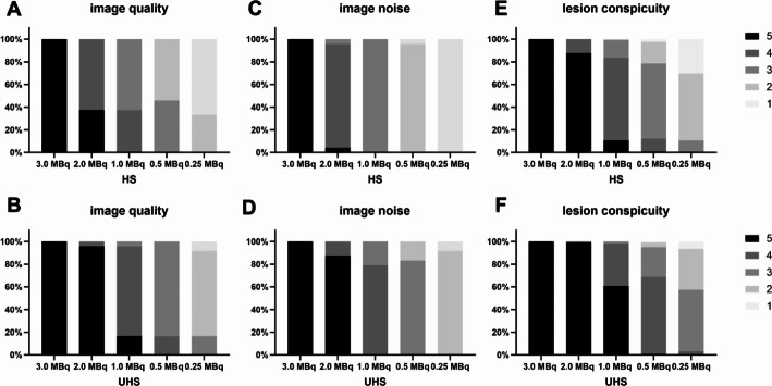 Results: Subjective image quality decreased with simulated reduction of injected activity with generally superior ratings in the UHS mode compared to the HS mode. Despite a reduction to 1 MBq/kg of [18F]SiTATE all lesions were still detected while at 0.25 MBq/kg lesion detectability decreased to 70% (HS) and 93% (UHS). Only minor changes in SUVmean and TLR were detected with reduced activity. However, reduced activities led to an increase in SUVSD, which in turn caused a decrease in SNR (at 1 MBq/kg: 7.3 in HS and 9.0 in UHS mode and an increase in deviation of the MTV.