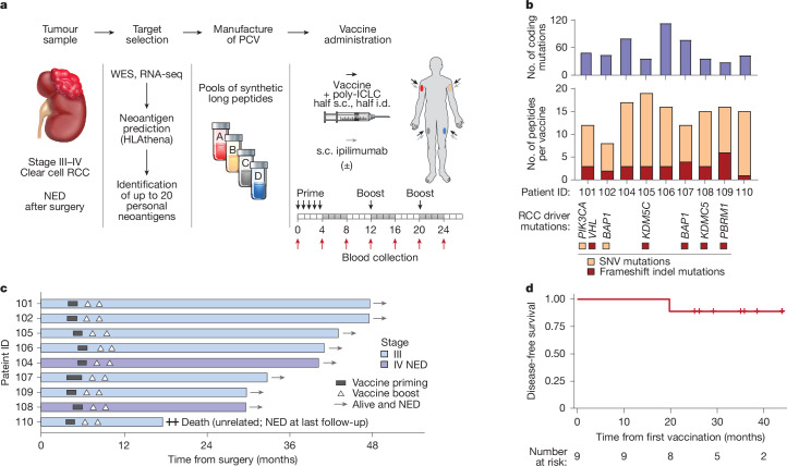 Personalized cancer vaccines (PCVs) can generate circulating immune responses against predicted neoantigens1-6. However, whether such responses can target cancer driver mutations, lead to immune recognition of a patient's tumour and result in clinical activity are largely unknown. These questions are of particular interest for patients who have tumours with a low mutational burden. Here we conducted a phase I trial (ClinicalTrials.gov identifier NCT02950766) to test a neoantigen-targeting PCV in patients with high-risk, fully resected clear cell renal cell carcinoma (RCC; stage III or IV) with or without ipilimumab administered adjacent to the vaccine. At a median follow-up of 40.2 months after surgery, none of the 9 participants enrolled in the study had a recurrence of RCC. No dose-limiting toxicities were observed. All patients generated T cell immune responses against the PCV antigens, including to RCC driver mutations in VHL, PBRM1, BAP1, KDM5C and PIK3CA. Following vaccination, there was a durable expansion of peripheral T cell clones. Moreover, T cell reactivity against autologous tumours was detected in seven out of nine patients. Our results demonstrate that neoantigen-targeting PCVs in high-risk RCC are highly immunogenic, capable of targeting key driver mutations and can induce antitumour immunity. These observations, in conjunction with the absence of recurrence in all nine vaccinated patients, highlights the promise of PCVs as effective adjuvant therapy in RCC.