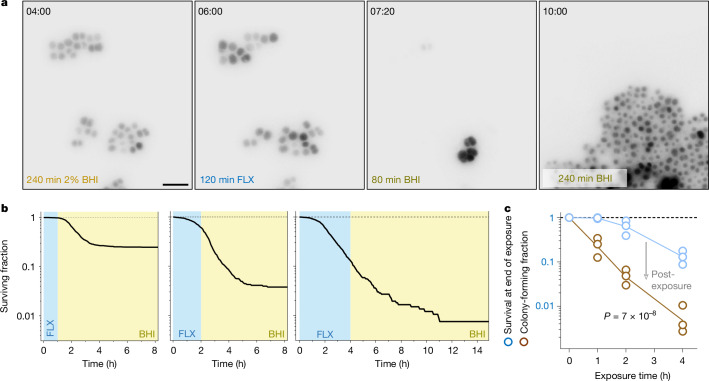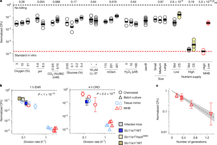 Antimicrobial compounds are essential for controlling bacterial infections. Stress-induced bacterial tolerance and persisters can undermine antimicrobial activities under laboratory conditions, but their quantitative effects under physiological conditions remain unclear1,2. Here we determined constraints on clearance of Salmonella by antimicrobials in infected mice and tissue-mimicking chemostats. The antibiotics enrofloxacin and ceftriaxone exhibited poor anti-Salmonella activity under both conditions, primarily owing to severe nutrient starvation, which restricted Salmonella replication3-5. Other infection-associated conditions, such as acidic pH, glucose, oxidative stress, nitrosative stress, antimicrobial peptides, osmolarity, oxygen limitation, carbon dioxide and carbonate, as well as drug efflux, toxin-antitoxin modules and cell size had limited effects. A subset of resilient Salmonella appeared as a key obstacle for clearance by enrofloxacin, based on the biphasic decline of Salmonella colony-forming units. However, these data were misleading, because colony formation was confounded by extensive post-exposure killing. More accurate single-cell, real-time assays showed uniformly slow damage, indicating high resilience across the entire Salmonella population. The resulting extensive survival of bulk bacteria minimized the effect of hyper-resilient persisters. Thus, starvation-induced general resilience of Salmonella was the main cause of poor antibiotic clearance. These findings highlight the importance of quantifying antibiotic activity with real-time, single-cell assays under physiological conditions.