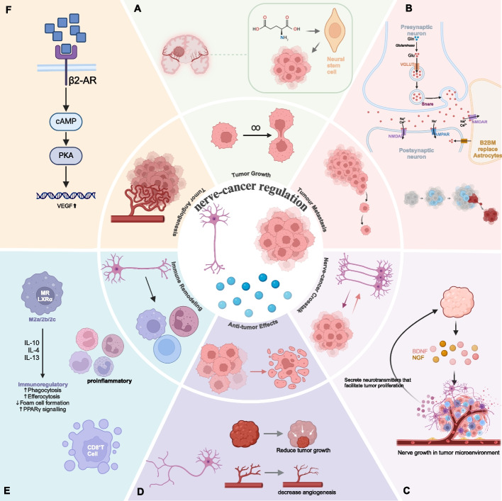 The activity of neurons in the vicinity of tumors is linked to a spectrum of cellular mechanisms, including the facilitation of tumor cell proliferation, synapse formation, angiogenesis, and macrophage polarization. This review consolidates the current understanding of neuro-oncological regulation, underscoring the nuanced interplay between neurological and oncological processes (termed as Cancer-Neuroscience). First, we elucidated how the nervous system accelerates tumor growth, metastasis, and the tumor microenvironment both directly and indirectly through the action of signaling molecules. Importantly, neural activity is also implicated in modulating the efficacy of therapeutic interventions, including immunotherapy. On the contrary, the nervous system potentially has a suppressive effect on tumorigenesis, further underscoring a dual-edged role of neurons in cancer progression. Consequently, targeting specific signaling molecules within neuro-oncological regulatory pathways could potentially suppress tumor development. Future research is poised to explore the intricate mechanisms governing neuro-tumor interactions more deeply, while concurrently refining treatment strategies for tumors by targeting the crosstalk between cancer and neurons.