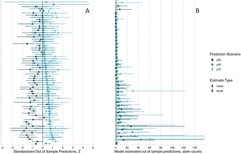 Forest plot of meta-analytic estimated out-of-sample predictions. A Standardized ( z -score) blue…