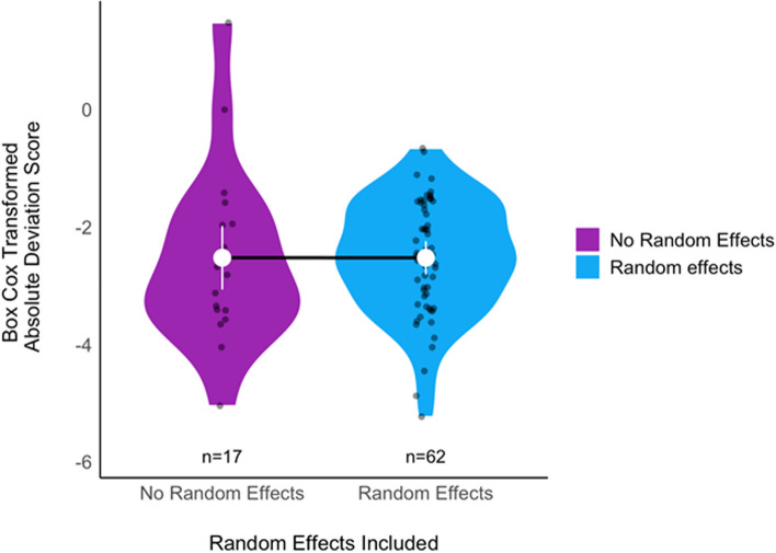Violin plot of Box-Cox transformed deviation from meta-analytic mean as…