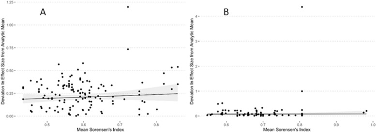 Violin plot of mean Box-Cox transformed deviation from meta-analytic mean as a function…