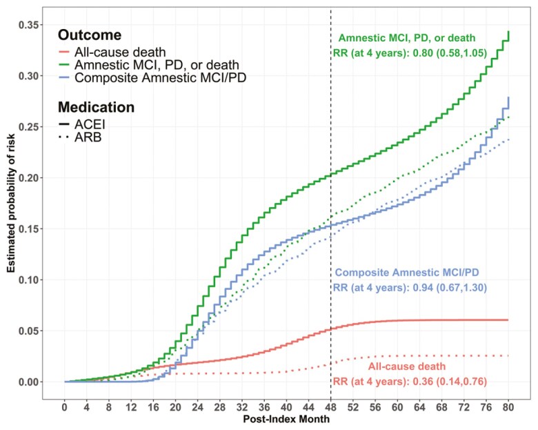 Results: Of 9,361 SPRINT participants (mean age 67.1 ± 9.5 years, 36.7% female, 58.7% non-Hispanic White), 710 and 1,289 were new users of an ARB or ACEI. Overall, 291 (41.0%) ARB initiators and 854 (66.3%) ACEI initiators were nonadherent during follow-up. The IP-weighted 4-year probabilities of full adherence and being alive among ARB was 56.0% (95% CI: 52.2%-59.9%) and 30.5% (95% CI: 28.0%-33.1%) for ACEI. The 4-year weighted risk ratios (RR) for amnestic MCI/PD and for amnestic MCI/PD/death with initiation and full adherence to ARB versus ACEI were 0.94 (95% CI: 0.66-1.29) and 0.79 (95% CI: 0.58-1.06). The weighted 4-year weighted RR for all-cause death with ARB versus ACEI initiation and adherence was 0.36 (95% CI: 0.14-0.76).