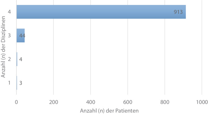 Results: In 94.7% of the trauma room care instances all 4 required disciplines were present, with an average of 6.6 individuals involved in the trauma room care. The 48‑h mortality rate was 3% among patients receiving trauma room care. In all deceased patients, all four disciplines were present during the trauma room care. At least one or more high-risk criteria for serious injuries were present in 40.8% of the patients. In these cases, a complete team consisting of all 4 disciplines was involved in 97.7% of the care instances.