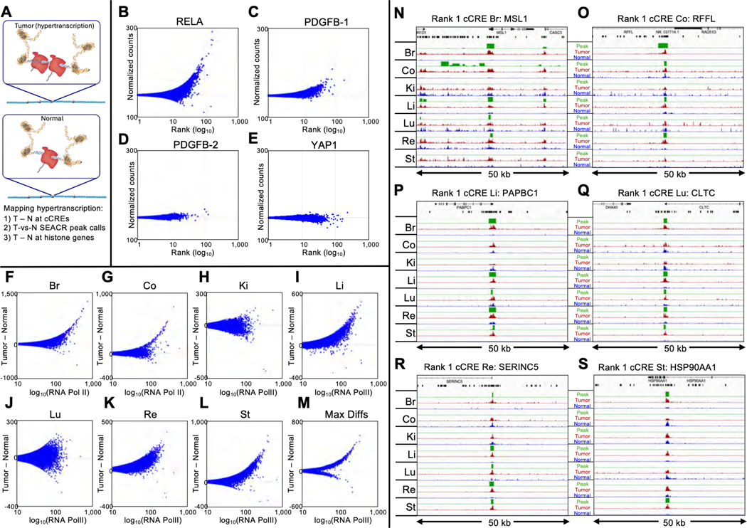 Genome-wide hypertranscription is common in human cancer and predicts poor prognosis. To understand how hypertranscription might drive cancer, we applied our formalin-fixed paraffin-embedded (FFPE)-cleavage under targeted accessible chromatin method for mapping RNA polymerase II (RNAPII) genome-wide in FFPE sections. We demonstrate global RNAPII elevations in mouse gliomas and assorted human tumors in small clinical samples and discover regional elevations corresponding to de novo HER2 amplifications punctuated by likely selective sweeps. RNAPII occupancy at S-phase-dependent histone genes correlated with WHO grade in meningiomas, accurately predicted rapid recurrence, and corresponded to whole-arm chromosome losses. Elevated RNAPII at histone genes in meningiomas and diverse breast cancers is consistent with histone production being rate-limiting for S-phase progression and histone gene hypertranscription driving overproliferation and aneuploidy in cancer, with general implications for precision oncology.