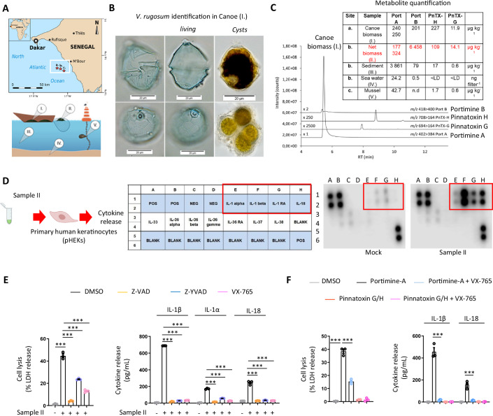 In 2020-2021, a "mysterious illness" struck Senegalese fishermen, causing severe acute dermatitis in over one thousand individuals following exposure through drift-net fishing activity. Here, by performing deep analysis of the environmental samples we reveal the presence of the marine dinoflagellate Vulcanodinium rugosum and its associated cyclic imine toxins. Specifically, we show that the toxin PortimineA, strongly enriched in environmental samples, impedes ribosome function in human keratinocytes, which subsequently activates the stress kinases ZAKα and P38 and promotes the nucleation of the human NLRP1 inflammasome, leading to the release of IL-1β/IL-18 pro-inflammatory cytokines and cell death. Furthermore, cell-based models highlight that naturally occurring mutations in the P38-targeted sites of human NLRP1 are unable to respond to PortimineA exposure. Finally, the development and use of human organotypic skins and zebrafish models of PortimineA exposure demonstrate that the ZAKα-NLRP1 axis drives skin necrosis and inflammation. Our results exemplify the threats to human health caused by emerging environmental toxins and identify ZAKα and NRLP1 as important pharmacological targets to mitigate PortimineA toxicity.