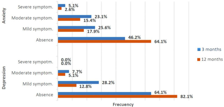 Results: Of 205 patients hospitalized for COVID-19, 153 (74.6%) presented with neurological manifestations. The most frequent were myalgia (32.7%), headache (31.7%), dysgeusia (29.2%), and anosmia (24.9%). Patients with more severe illness at the time of hospitalization presented fewer neurological manifestations. Of the 62 patients who underwent neuropsychological examination 3 months after discharge, 22.6% had impaired attention, 19.4% impaired working memory, 16.1% impaired learning and retrieval, 9.7% impaired executive functions, and 8.2% impaired processing speed. Patients with anosmia also presented with more headache (OR 5.45; p < 0.001) and greater risk of working memory impairment (OR 5.87; p 0.03). At follow-up 12 months after hospital discharge, 14.3% of patients still showed impaired attention, 2.4% impaired working memory, 2.5% impaired executive functions, and 2.5% impaired processing speed.