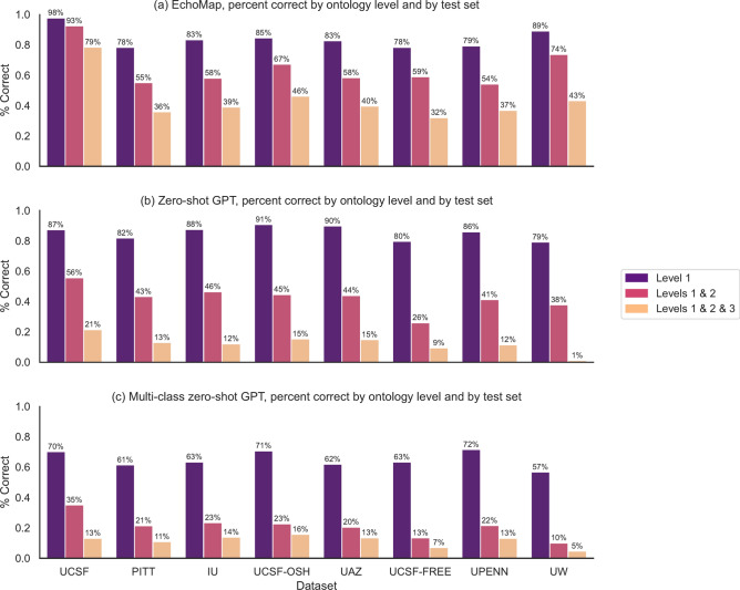 Big data can revolutionize research and quality improvement for cardiac ultrasound. Text reports are a critical part of such analyses. Cardiac ultrasound reports include structured and free text and vary across institutions, hampering attempts to mine text for useful insights. Natural language processing (NLP) can help and includes both statistical- and large language model based techniques. We tested whether we could use NLP to map cardiac ultrasound text to a three-level hierarchical ontology. We used statistical machine learning (EchoMap) and zero-shot inference using GPT. We tested eight datasets from 24 different institutions and compared both methods against clinician-scored ground truth. Despite all adhering to clinical guidelines, institutions differed in their structured reporting. EchoMap performed best with validation accuracy of 98% for the first ontology level, 93% for first and second levels, and 79% for all three. EchoMap retained performance across external test datasets and could extrapolate to examples not included in training. EchoMap's accuracy was comparable to zero-shot GPT at the first level of the ontology and outperformed GPT at second and third levels. We show that statistical machine learning can map text to structured ontology and may be especially useful for small, specialized text datasets.