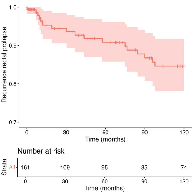 Results: Of the 175 patients, 14 patients had exclusion criteria, 57 had died, and 42 were lost to follow-up, leaving 62 patients for analysis. Seventeen patients presented with a recurrence (10.5%) at the 10-year follow-up. The only statistically significant risk factor for recurrence was recurrent RP (HR = 11.5 (2.54-52.2), P = 0.002). The median faecal incontinence score was 4 (0-10) and significantly worse in patients who had a recurrence [12 (7-13) vs 3 (0-9); P = 0.016]. The median obstructive defaecation score was 6 (3-12). The median quality of life score was 7 (6-8). Most patients who presented with a recurrence said they would undergo the operation again and recommended it, as would patients with no recurrence.